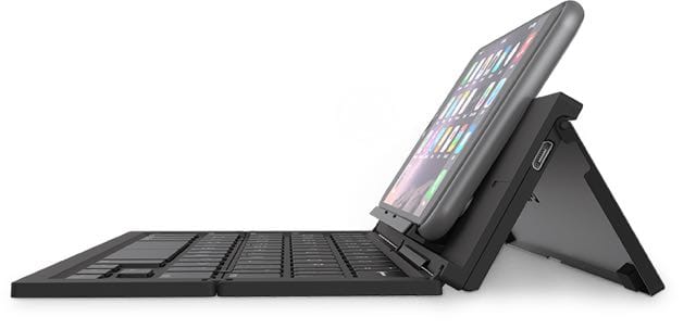 The Bluetooth keyboard folds up into a compact size that’s small enough to fit into a jacket pocket or bag.