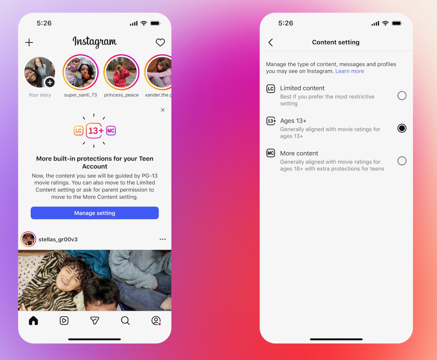 The new teen accounts will have a PG-13 rating which means users will see similar content as would be seen in a PG-13 movie.