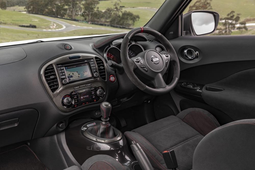Inside the Nissan Juke NISMO RS has a black centre console and a carbon look finish on the head unit and gearshift surrounds.
