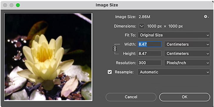 - Go to Image > Image Size. Now, uncheck Resample to preserve details and change the resolution in the Image Size box to 300 DPI for print or 72 DPI for web, as required.