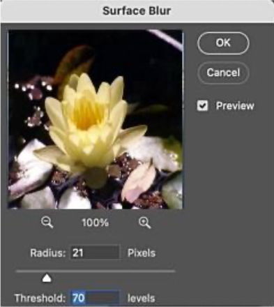 - Navigate to Filter > Blur > Surface Blur to smooth out pixelated edges. Next, adjust the radius and threshold sliders to an acceptable level to avoid over-blurring.