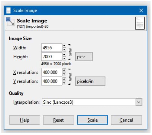 - Go to Image > Scale Image. Then, increase the width/height and select “Sinc (Lanczos3)” as the interpolation method for better quality.