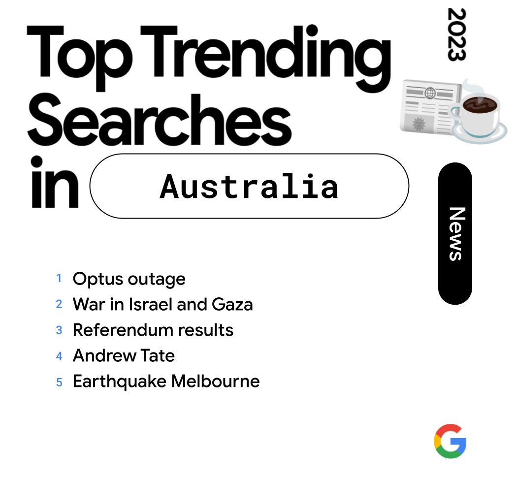 The recent Optus outage – the largest in Australian history – also figured at the top of the Google searches s people tried to find information that Optus was not providing in a timely manner.