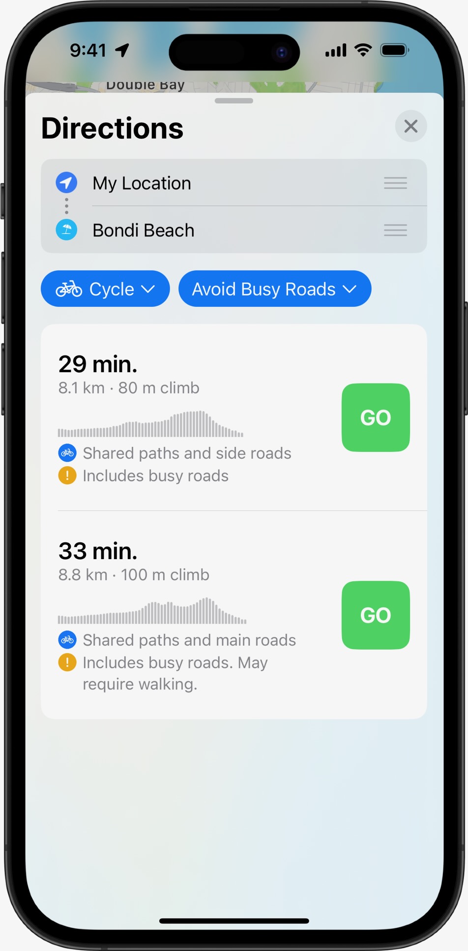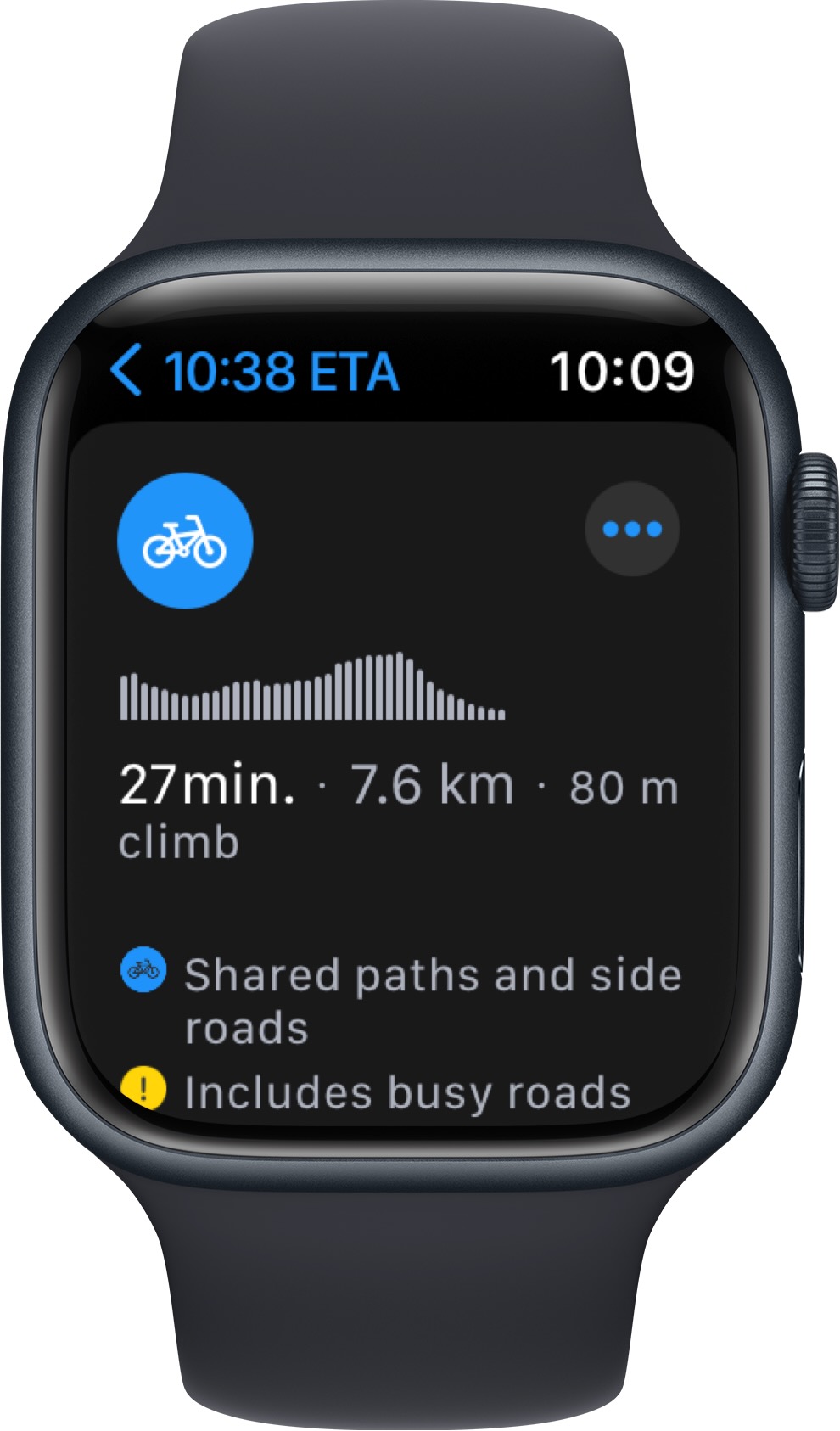 Information like elevation changes and of their journey involves a bike path, a side or main road and the times they will need to dismount and walk will all be displayed on Apple Watch.