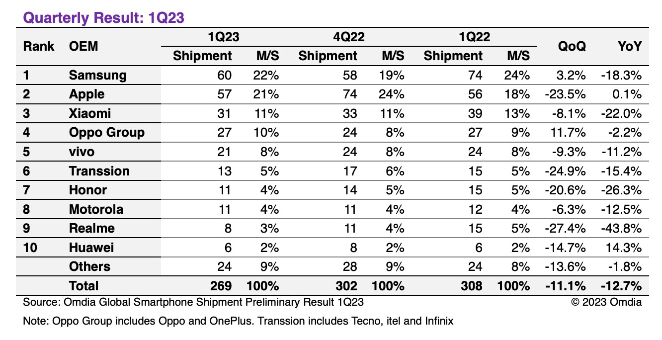 But despite the year on year slump, Samsung still recorded the most shipments in Q1 2023 with 60 million.