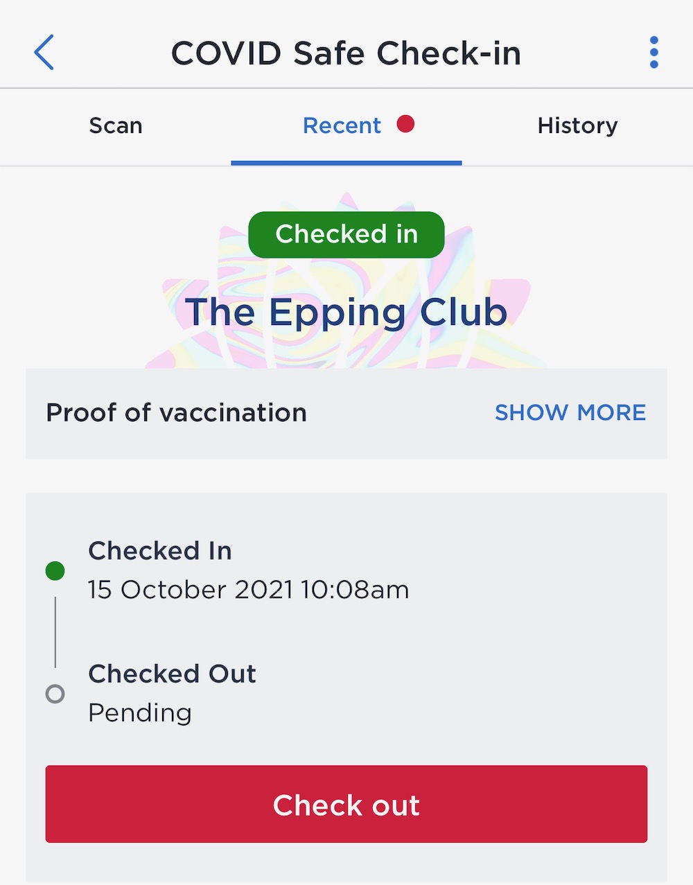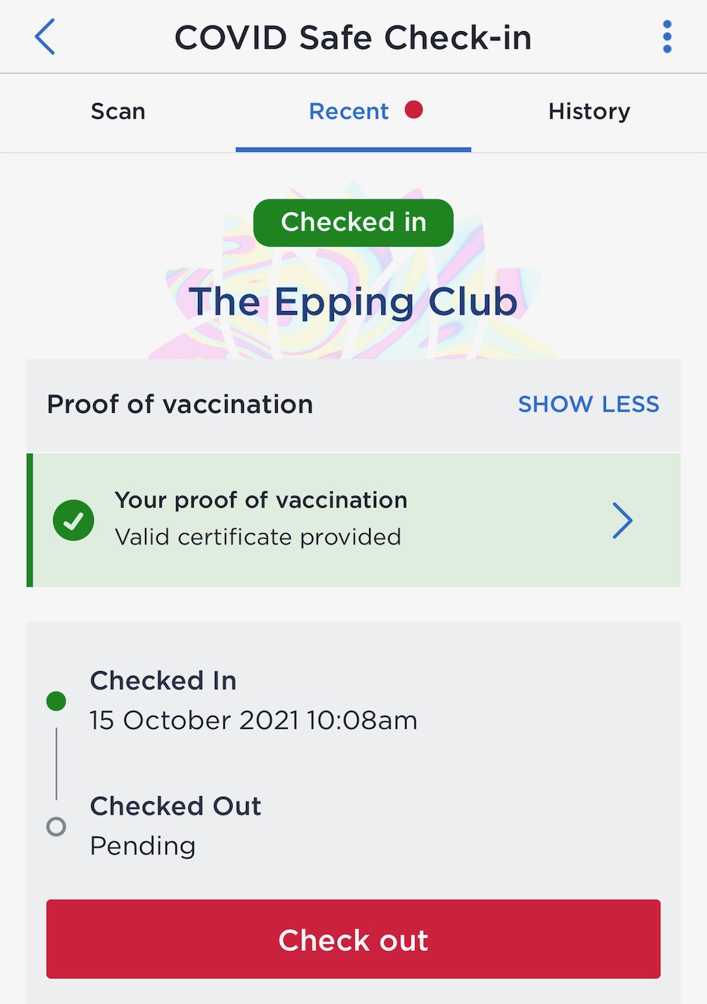 Next step is for when you arrive at a venue where you must check in AND show your vaccination certificate. You check in like normal and it will say Checked In above the name of the venue which now has a shimmering watermark behind it.