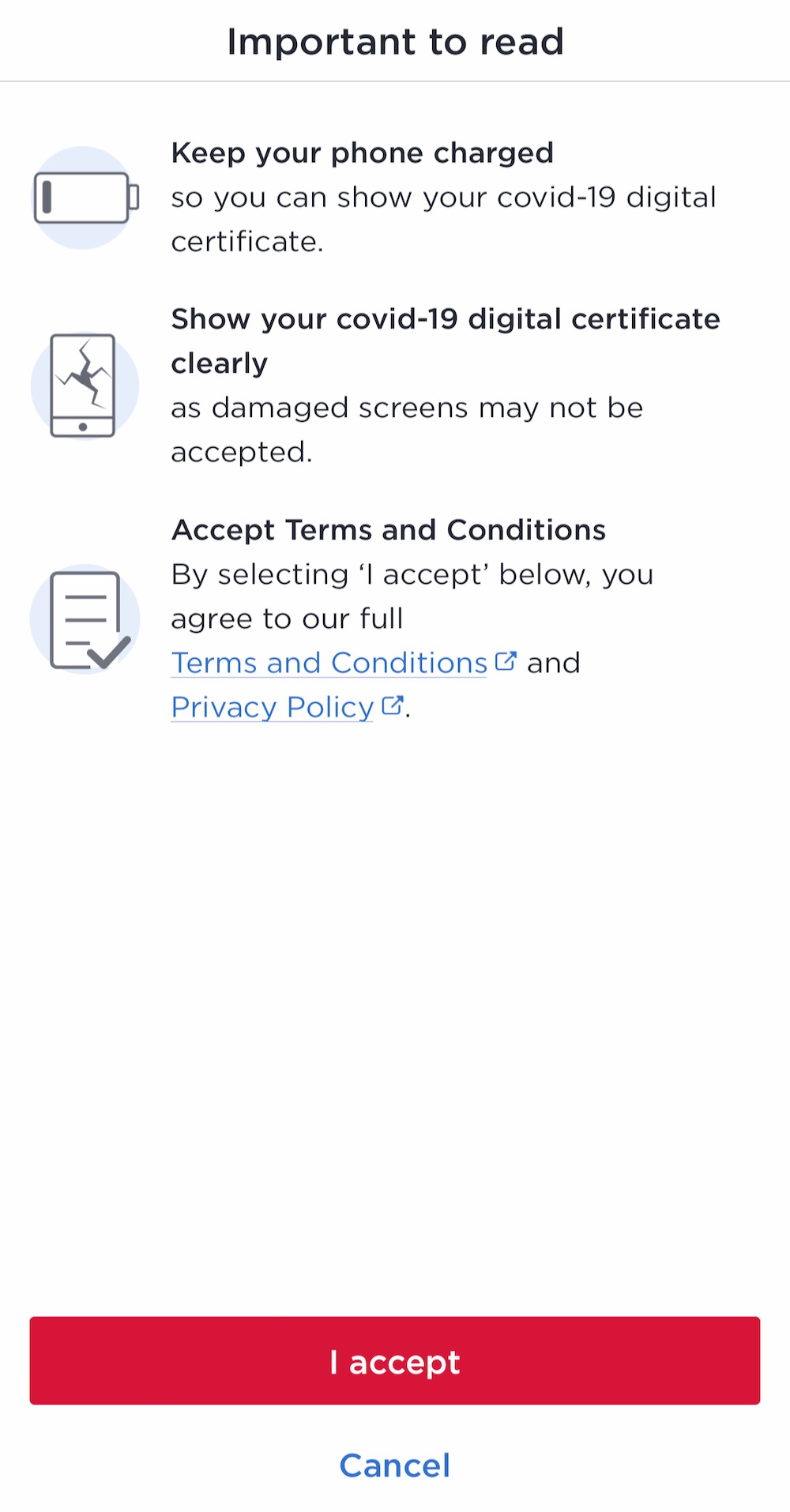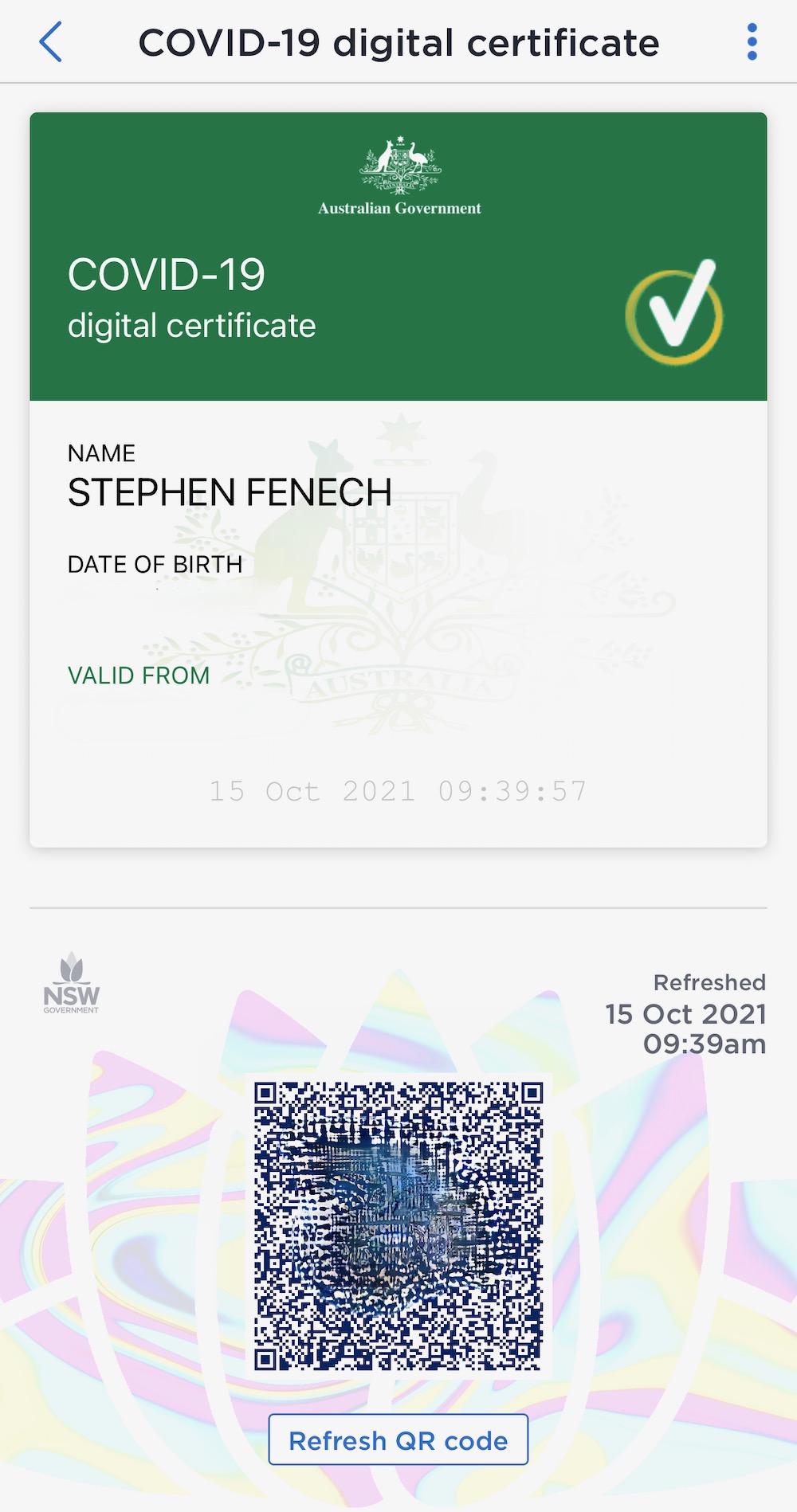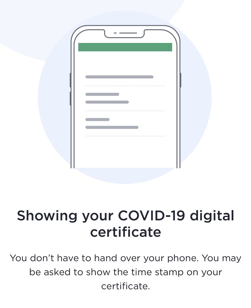 You’ll also see a QR code here which will change every time you open the certificate. This QR code can be scanned by the venue to confirm your identity.