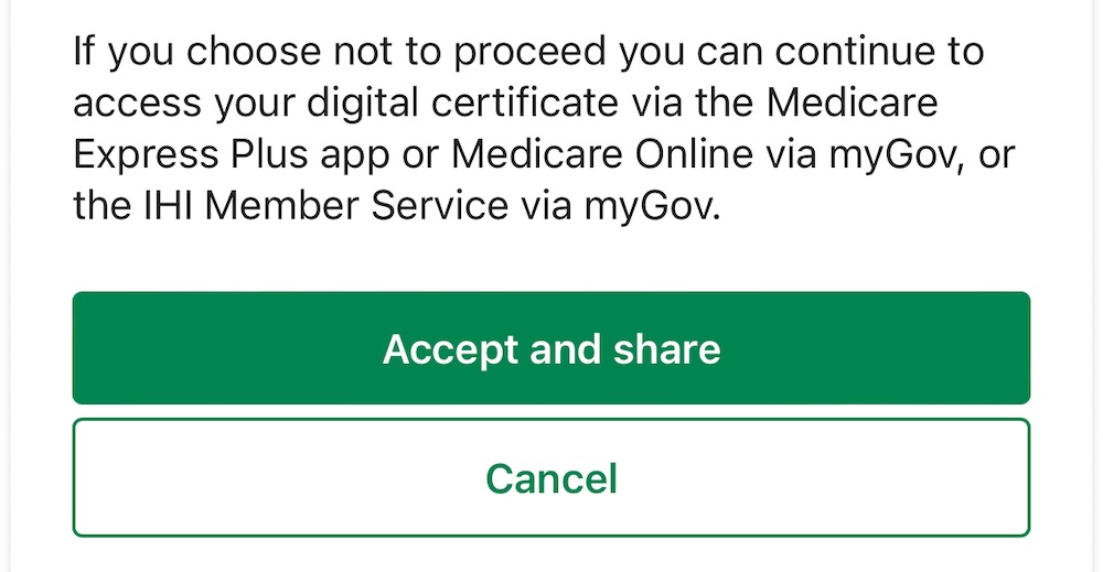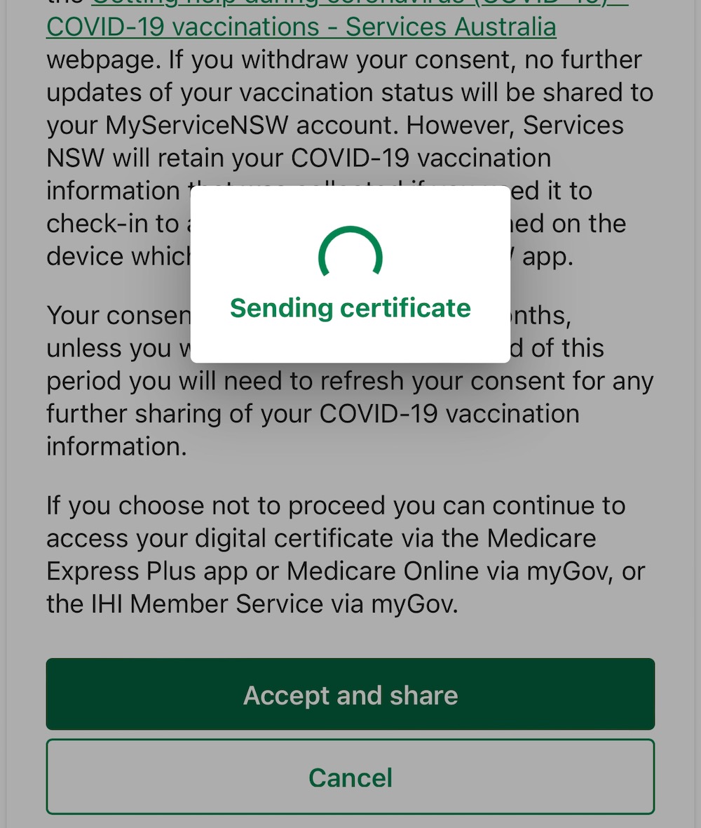 At this point you are advised that you will be leaving the Medicare app and taken into the Service NSW app to complete the vaccination certificate sharing. You will have to hit the I Accept button on some terms and conditions in the Service NSW before it tells you it is preparing your COVID-19 digital certificate.