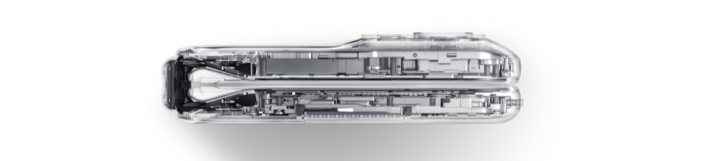 This hinge also eliminates the gap between the displays when the device is folded for a slimmer look and better protection of the inside display.