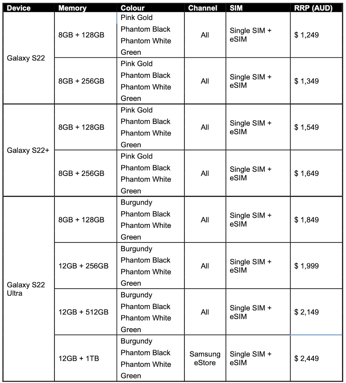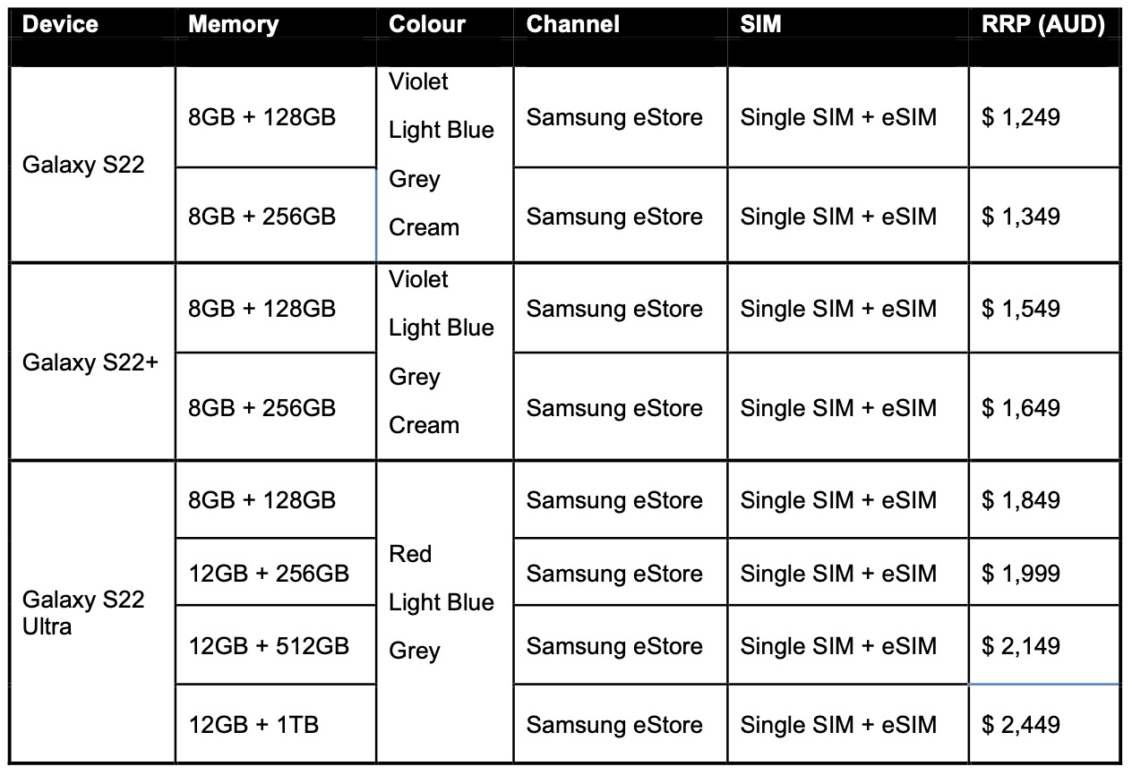 The Samsung Galaxy S22 will be priced from $1,249, the S22+ from $1,549 and the S22 Ultra from $1,849. Memory capacities start at 128GB and go up to 256GB for the S22 and S22+ while the S22 Ultra starts at 128GB and 256GB, 512GB and 1TB variants.