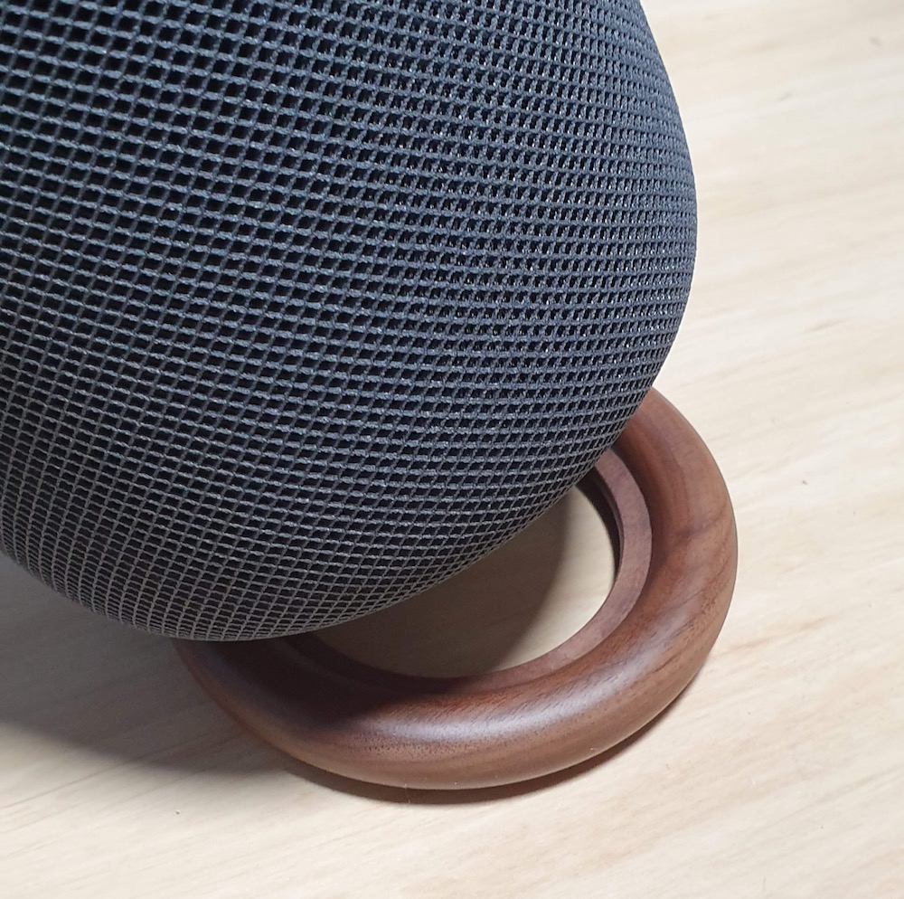 The stand is designed to exactly fit the Apple HomePod so we can rest snugly on it.