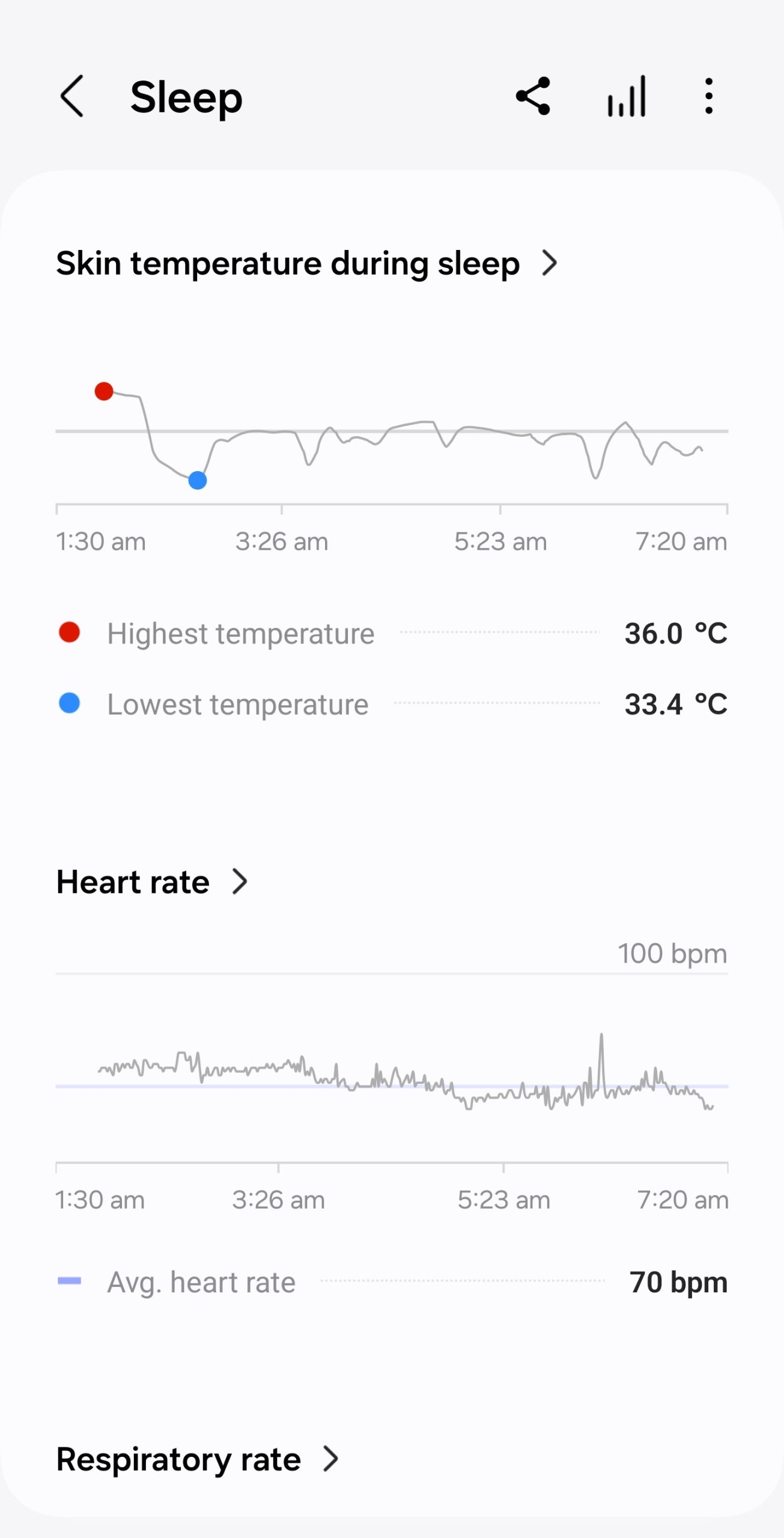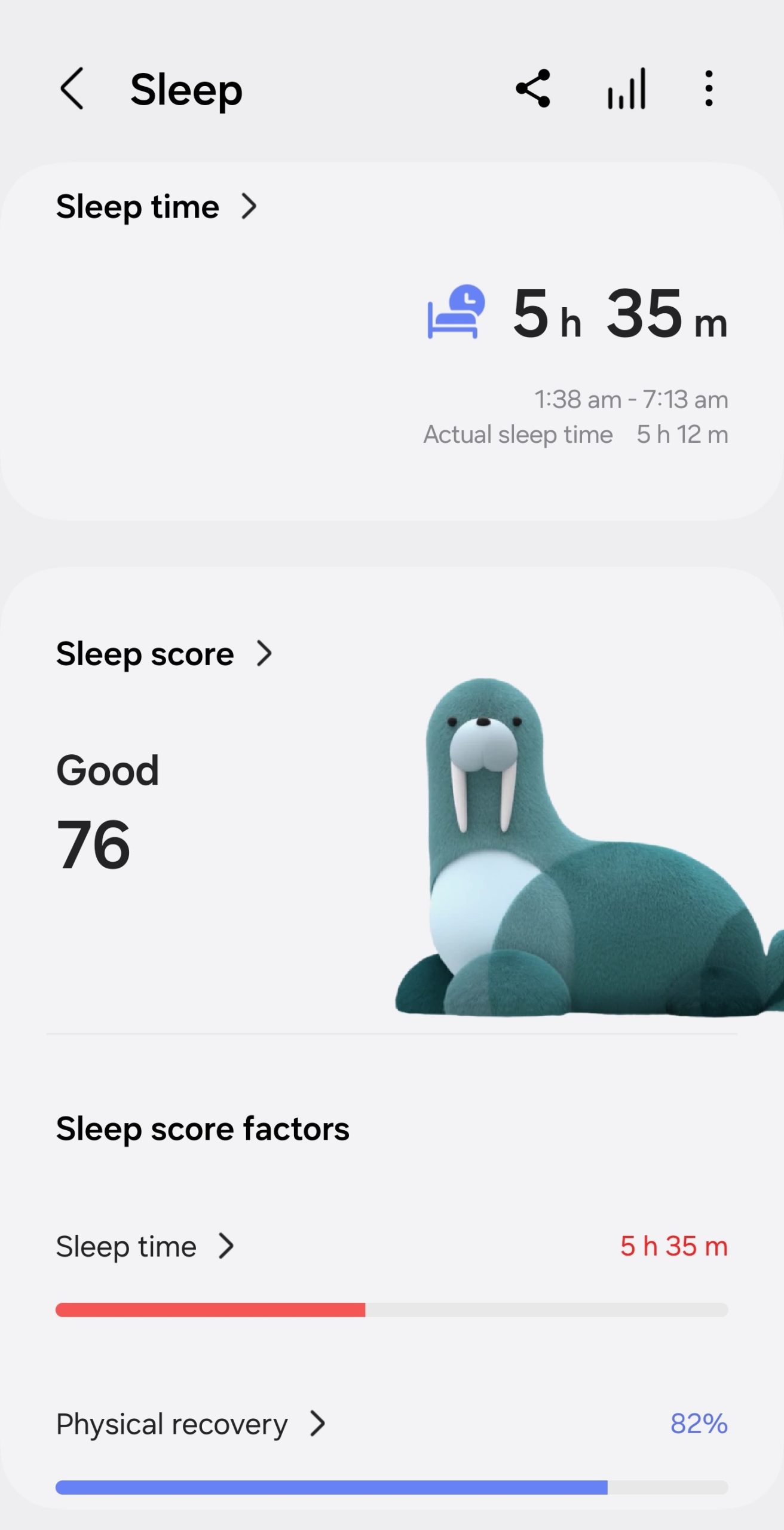 I usually sleep between five and six hours a night and earned a sleep score of 76 which Galaxy Ring told me is five points higher than the average for my age group.